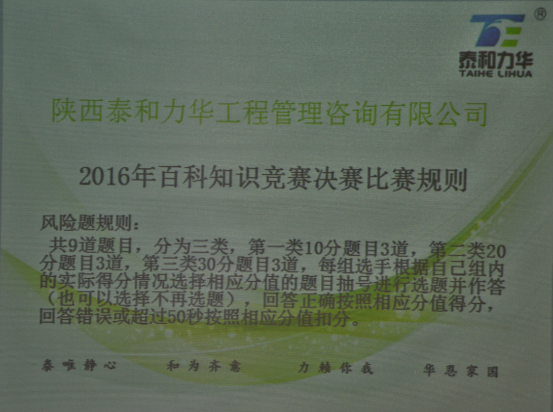 本次活动的目的是为营造健康、向上的工作氛围,丰富员工文化生活、提高员工综合素质、增强团队凝聚力。从活动方案的策划、题库的征集、决赛活动现场布置等诸多环节中,得到了公司领导指导和大力支持。经过初赛,由九名选手分三组分别代表部门参加决赛。在决赛活动现场,每名选手积极抢答,人人争先恐后,各个力争上游,现场气氛热烈,掌声此起彼伏,充分展示了泰和力华全体同事良好的精神风貌。经过激烈的竞赛,最终工程管理部获得了“2016年度百科知识竞赛团体奖”,季存爽同志获得了“2016年度百科知识竞赛最佳答题手”。